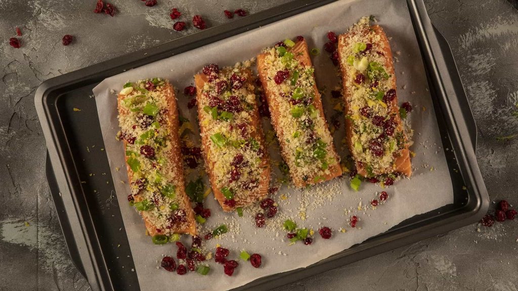 - Combine panko, cranberries, onion, 2 tbsp. butter, thyme, and lemon peel in a bowl and season with salt and pepper. Press mixture on salmon and drizzle with 1 tbsp. melted butter.